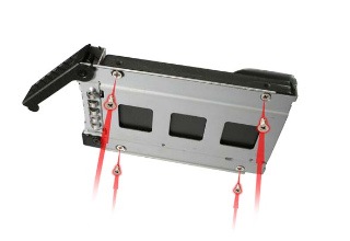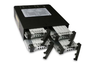 ラック本体に2.5インチドライブを4台まで搭載可能。 SATA/SASインターフェイのHDDやSSDに対応しています。 ディスクトレイはワンタッチで取り外す事ができます。
