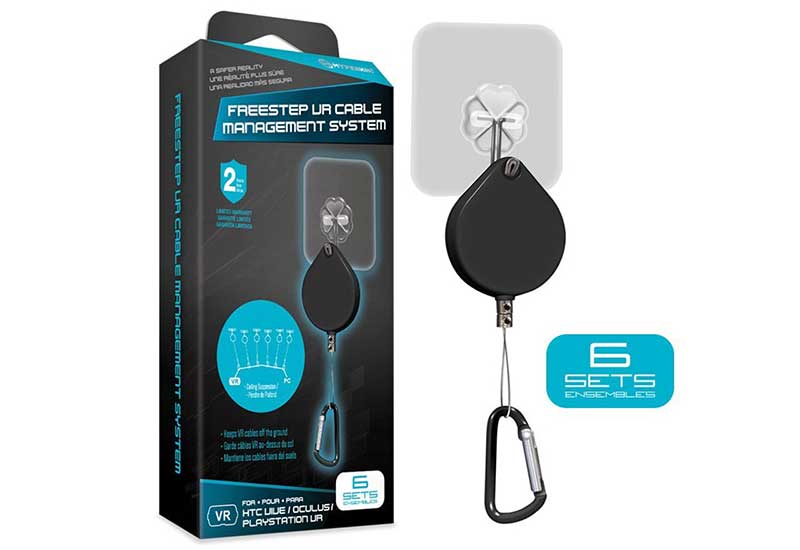 伸縮自在のワイヤーとカラビナクリップを装備。VR機器用のケーブルマネジメントシステム