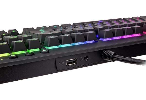 USBデバイスの充電やデータ転送に便利なUSBパススルーポートのほか、3.5mmステレオミニプラグに対応したオーディオパススルーポートを搭載。また、キーボードの右上にマルチメディアキーを装備しており、ゲーム中でもスムーズにオーディオをコントロールすることが可能です。