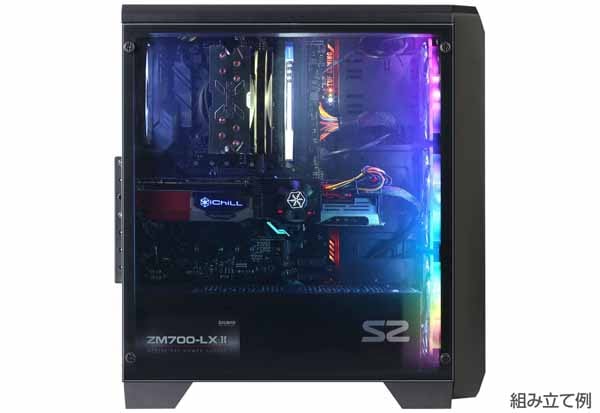 S2 TGは、エアフローを重視したスリットデザインのフロントパネルを採用したミドルタワー型PCケースです。ケース前面と背面に計3基の120mmファンを搭載するほか、サイドパネルにはフレームレスの4mm厚強化ガラスを採用し、内部に組み込んだパーツやイルミネーションを楽しむことが可能です。