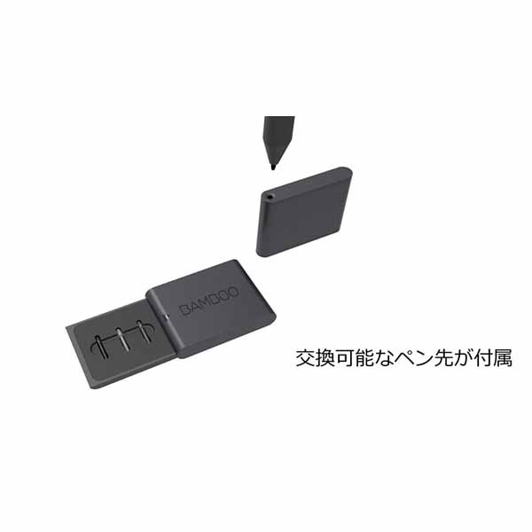 | パッケージ内容 | ・Bamboo Ink ・単6電池 ・クイックスタートガイド ・ペン先キット (替え芯は、ソフトx2*、ミディアムx1、ハードx1の3種類) *スタイラスに標準搭載のペン先(ソフト)を含む |