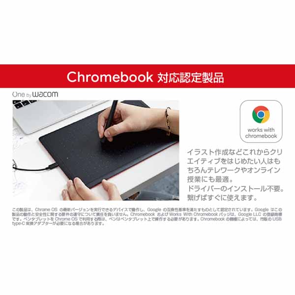 *5 この製品は、Chrome OS の最新バージョンを実行できるデバイスで動作し、Google の互換性基準を満たすものとして認定されています。Google はこの製品の動作と安全性に関する要件の遵守について責任を負いません。Chromebook およびWorks With Chromebookバッジは、Google LLC の登録商標です。ペンタブレットをChrome OSで利用する際は、ペンはペンタブレット上で操作する必要があります。Chromebookの機種によっては、市販のUSB type-C変換アダプターが必要になる場合があります。