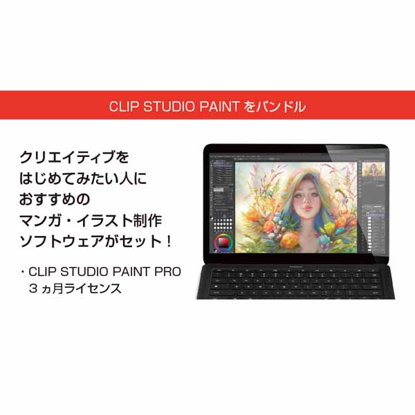 | セットソフトウェア | ・CLIP STUDIO PAINT PRO(3ヶ月ライセンス) (*CLIP STUDIO PAINT PRO(3ヶ月ライセンス)はWindows / macOS / Chromebook のいずれか1台でご利用いただけます) ※Wacom IDへの登録が必要となります。*4 |