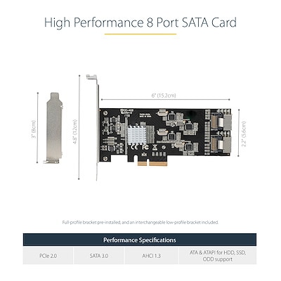 | ハードウェア | ポート: 8 インターフェース: SATA バス型: PCI Express カードタイプ: Standard Profile (LP bracket incl.) 業界標準: シリアル ATA 3.0 仕様 - SATA 1.0/2.0/3.0 (それぞれ1.5/3/6Gbpsに対応) PCI Express ベース仕様 バージョン2.0 チップセットID: Pericom - PI7C9X2G608GP ASMedia - ASM1061 |