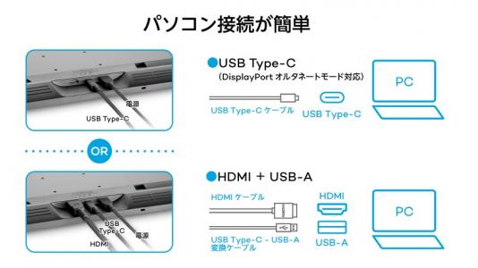 USB Type-Cケーブルまたは、HDMIケーブルとUSB Type-C to USB-Aケーブルをパソコンに接続。 シンプルで簡単に接続ができます。*電源ケーブル接続も必要です。