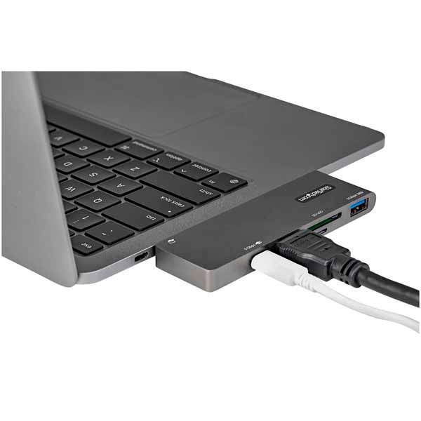 HDMI対応USB-C接続マルチポートアダプタ。MacBook Pro、MacBook Air(M1チップ搭載モデルを含む)、Google Pixelbookその他USB-C搭載ノートパソコン/タブレットを外出先でもフル機能環境として使えるソリューションです。4K/30HzのHDMI出力、USB Type-Cポート(電力+データ)、USB 3.2 Gen 1 Type-Aポート(5Gbps)1口、SDおよびMicroSD(uSD)カードのすべてをノートパソコンのUSB-C(またはThunderbolt 3)ポートに一括接続します。