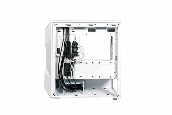前面に120mm径のアドレサブルRGBファンを2基搭載。ケース内に最大6基のファンを搭載できるほか、最大280mmの水冷ラジエータの取り付けにも対応。また、5つのアドレサブルRGBポートと4つのPWMポートを備えたARGB/PWMハブも装備しています。
