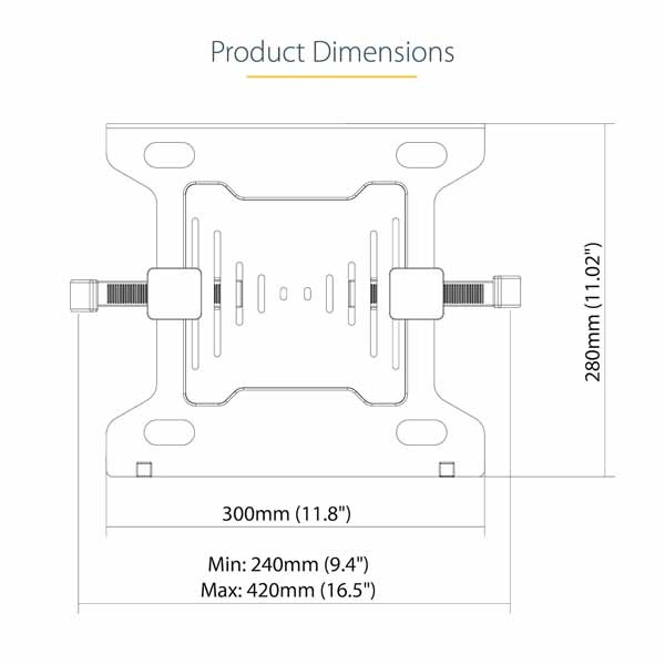 VESA互換ノートパソコントレイ(300mm x 280mm)。VESA対応のモニターマウント、スタンド、アームなどに取り付けて使用します。重さ4.5kg、幅24cmから42cm、高さ2.5cmまでのノートパソコンに対応し、デスクスペースを広げながらノートパソコンへのアクセスを確保します。尚、アームやスタンドは製品に含まれていません。併用するアームやスタンドで、75x75mm/100x100mmのVESA規格、ノートパソコンとトレイの合計重量に対応している必要があります。