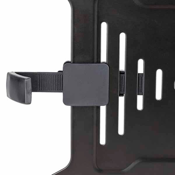・しっかり固定:パッド付きグリップアームを使用し、幅24cmから42cmまでのノートPCを斜めにホールド。ポートを塞がない位置にグリップを調整可能。底部ストッパー (高さ12.7mm - 22.8mm)でノートパソコンの脱落を防止