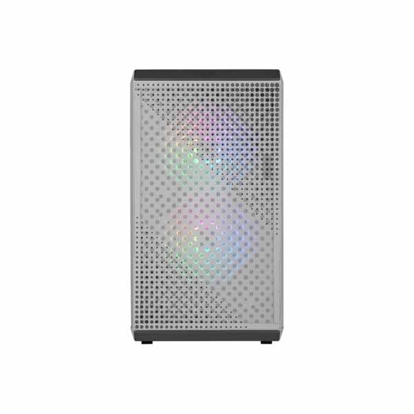 フロントパネルとケース上部に、幾何学模様のマグネット式ダストフィルターを装備したコンパクトなミニタワー型PCケースです。小型ながらも十分な拡張性を備え、妥協のない冷却システムを構築できるほか、大型のクリアサイドパネルを搭載しており、PCのライトアップを楽しむことができます。