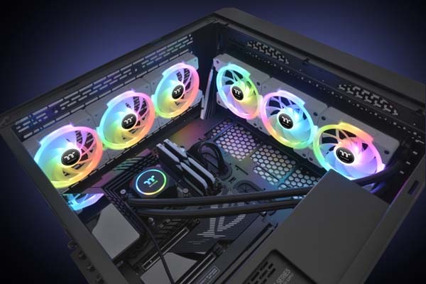 ・リング状に並んだアドレサブルRGB LEDを搭載 ファンの外周と軸受部分に、リング状に並んだ20個のアドレサブルRGB LEDを搭載。付属の専用コントローラーに接続して「TT RGB PLUS」ソフトウェアを使用することにより、LEDカラーの個別設定やプロファイルの作成、ファンスピードのコントロールが可能です。