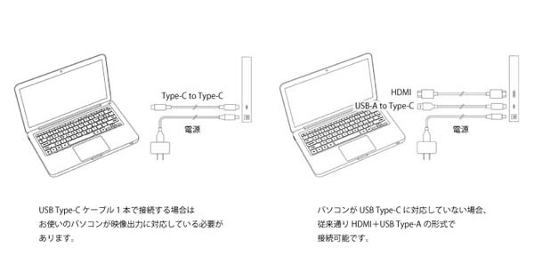 USB Type-Cケーブル1本での接続に対応しています。iMac、MacBook Pro、Windowsコンピュータをアダプターなしで簡単に接続可能です。また、パソコンがUSB Type-Cに対応していない場合、従来通りHDMI+USB Type-Aの形式で接続可能です。