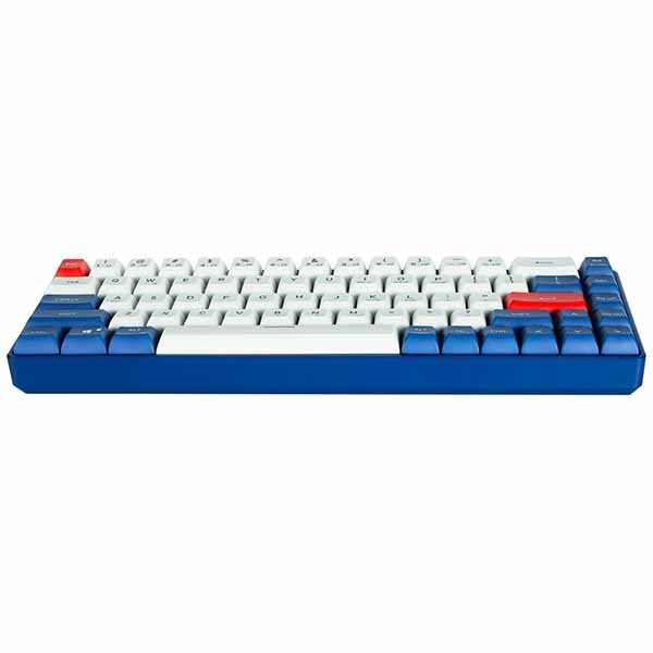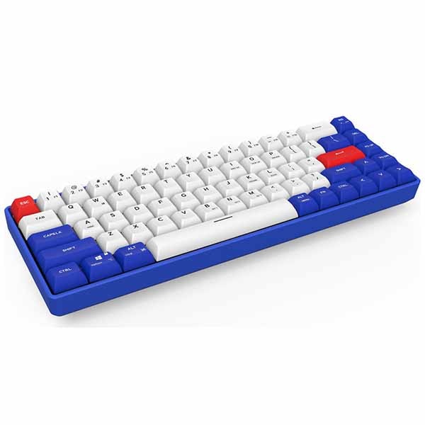 鮮やかなブルーとレッドが映えるカラーリングを採用し、省スペースで携帯性にも優れた65%キーボードです。アルミニウムフレームと吸音材の組み合わせでタイピング時の打鍵音を抑え、高い静音性と耐久性を提供します。