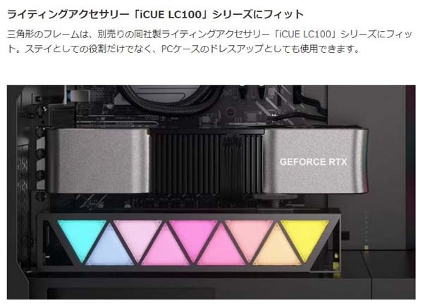 ・ライティングアクセサリー「iCUE LC100」シリーズにフィット 三角形のフレームは、別売りの同社製ライティングアクセサリー「iCUE LC100」シリーズにフィット。ステイとしての役割だけでなく、PCケースのドレスアップとしても使用できます。