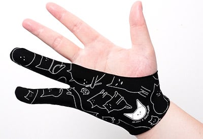 絵を描くときに2本指のグローブを着用して、手とペンタブレット表面との摩擦を低減。両利き通用。