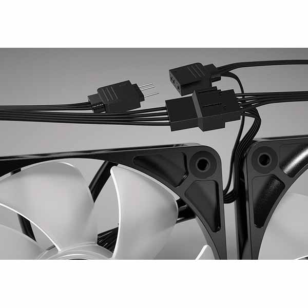 ファン同士をデイジーチェーン接続可能な4ピンPWMコネクタを採用。マザーボードのイルミネーションと同期可能なRGB LEDを搭載しており、5V ARGBコネクタ1つでコントロールすることができます。