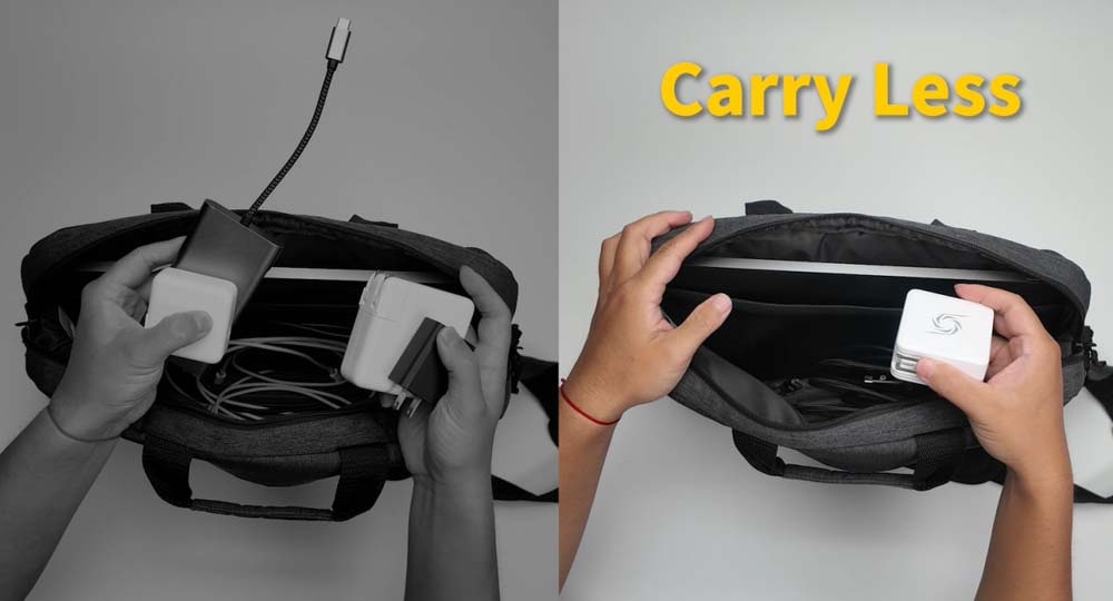 本体は66×62×36.6mmとコンパクト。手のひらサイズなので、かばんに入れて手軽に持ち運べます。外出先で、ノートパソコンやスマートフォンを充電しながらキーボードやマウスを接続したり、配信を行うことができます。
