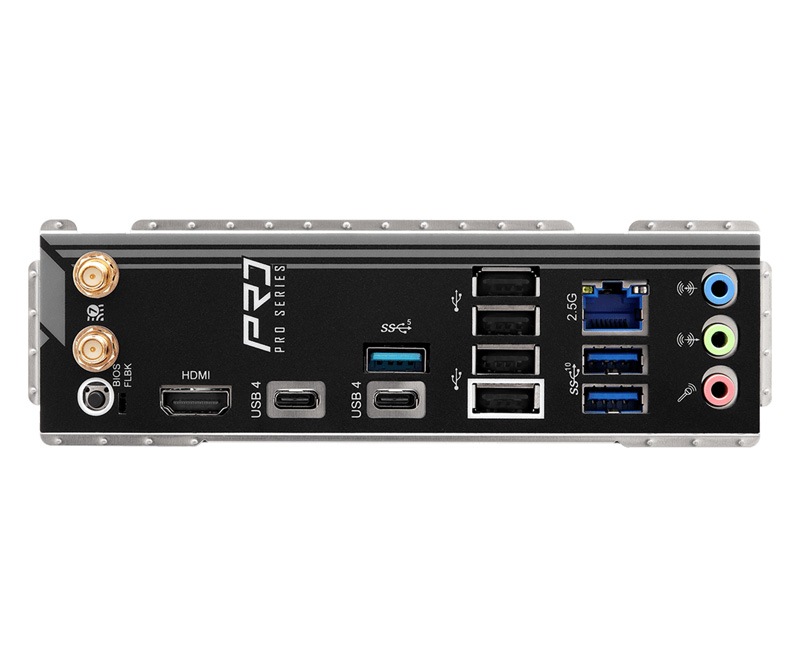 | リアパネルI/O | - アンテナポート x 2 - HDMIポート x 1 - USB4 Type-Cポート x 2 (40 Gb/s) * - USB 3.2 Gen2 Type-Aポート x 2 (10 Gb/s) - USB 3.2 Gen1 Type-Aポート x 1 - USB 2.0ポート x4 - RJ-45 LANポートx 1 - BIOSフラッシュバックボタン x 1 - HDオーディオジャック: ライン入力 / フロントスピーカー / マイク * USB PD 3.0最大5V@3A(15W)充電をサポート |