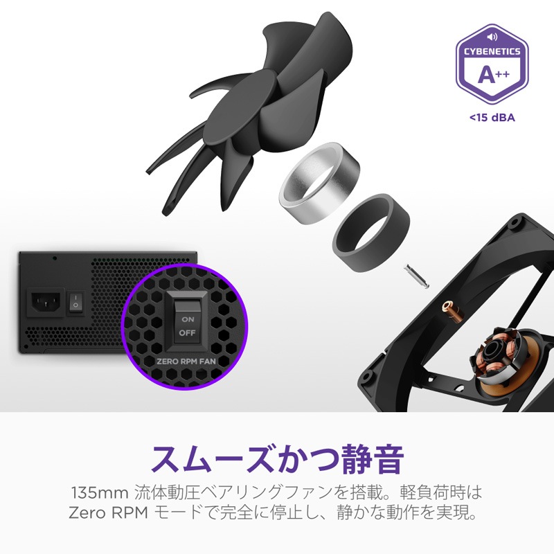・高効率認証で省エネと静音を両立:80 PLUS GoldおよびCybenetics Platinumの高効率認証により、省エネ性能に優れます。騒音評価もA++を獲得し、静音性にも配慮されています。