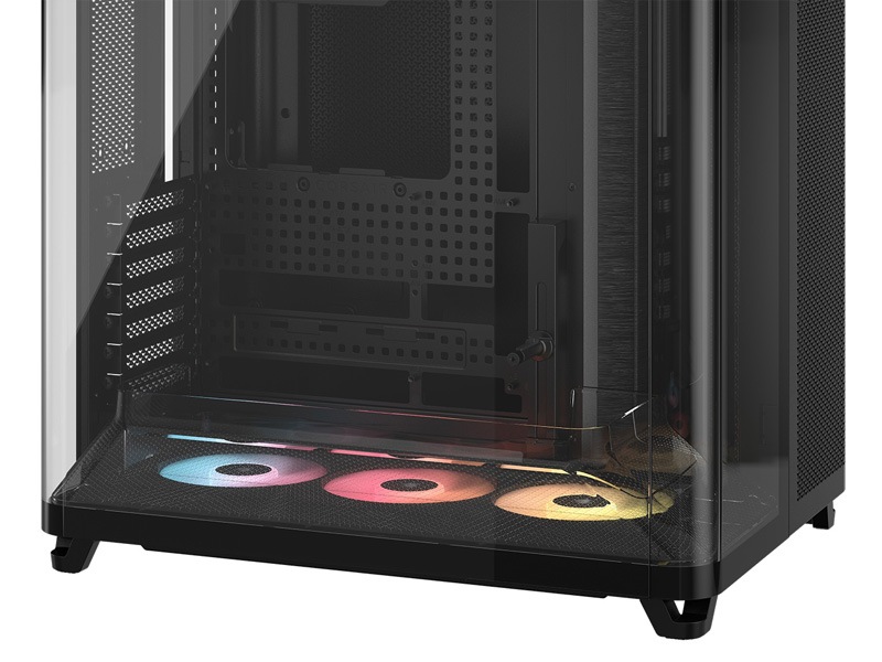 ・リバースローターARGBファン:120mmのリバースローターARGBファンを3基標準搭載。美しいライティングと高いエアフローを実現し、ケース内部を効果的に冷却します。